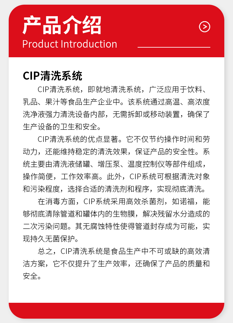 降低污染风险:整个清洗过程在密闭的生产设备、缸罐容器和管道中运行,减少二次污染机会。