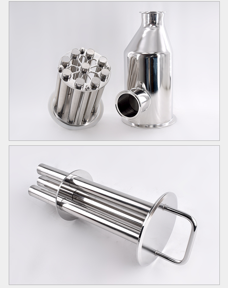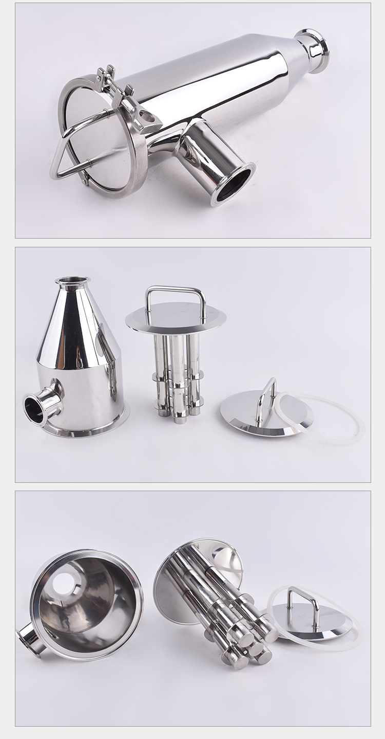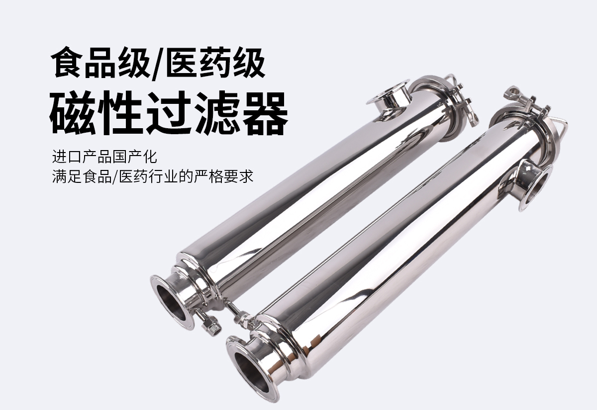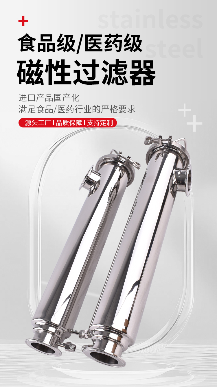 不锈钢磁性过滤器由磁棒组和不锈钢筒体组成,利用磁棒产生的强大磁场,过滤液体、浆料、风送管道输送的粉体、气体等物料中的细小铁杂质。常见类型有法兰式、快装式等。