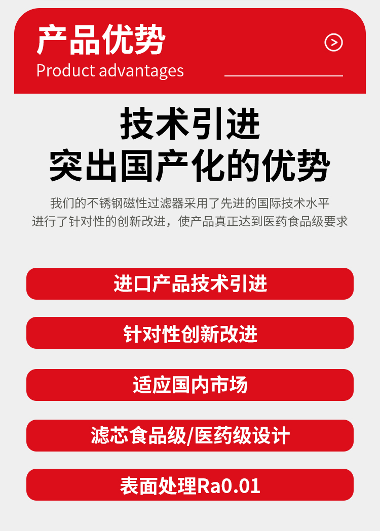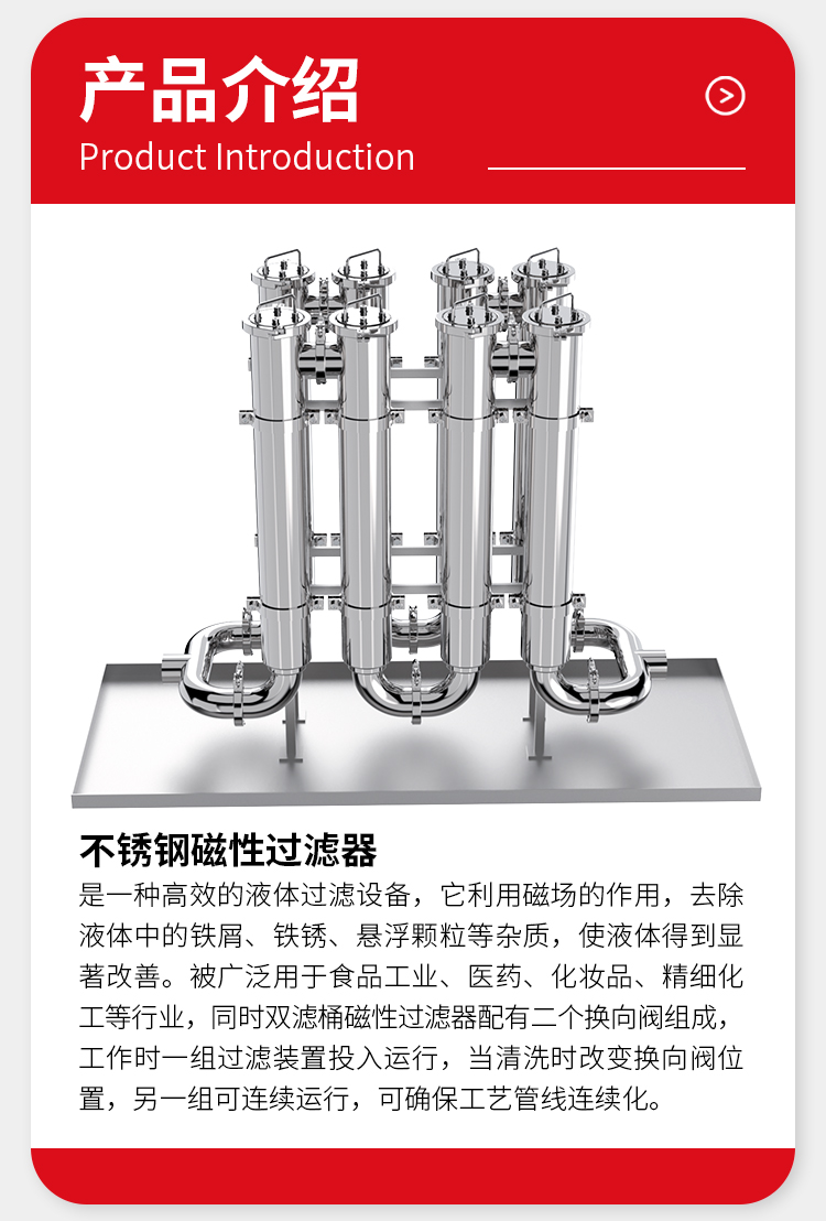 - 广泛应用于化工、制药、颜料、染料、食品、冶金、陶瓷、石油化工、制冷、塑料等行业,用于分离液体介质中含有的细度铁屑成分,降低产品中的铁离子含量,提高产品质量,保护设备管道上的配件免受磨损和堵塞,确保设备正常工作。