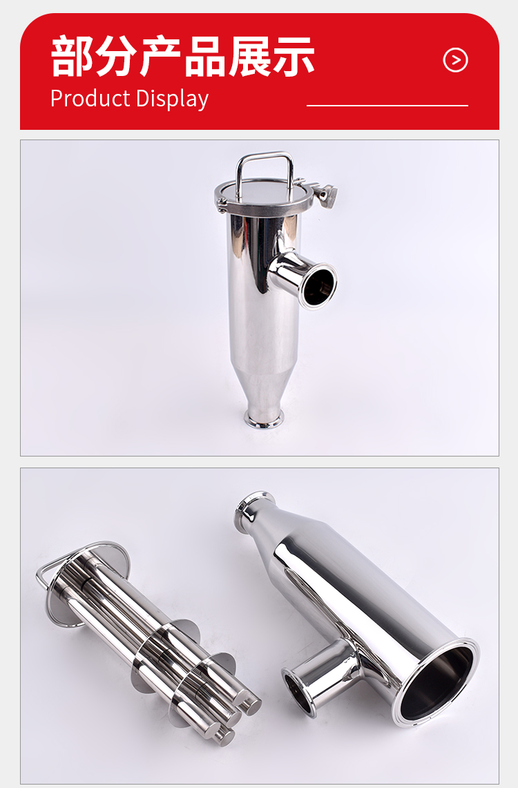 - 清理方便:清理时,可旋开主管底部排污口螺塞,排净流体,拆卸法兰盖,取出滤网或磁棒清洗后重新装入即可继续使用;部分快装式过滤器清理时,先拧松盖上夹紧螺丝,取出套管盖部件,抽出磁棒,吸附的铁性杂质自动脱落,清理后将套管装入筒体,拧紧夹紧螺丝,再插入磁棒盖即可。