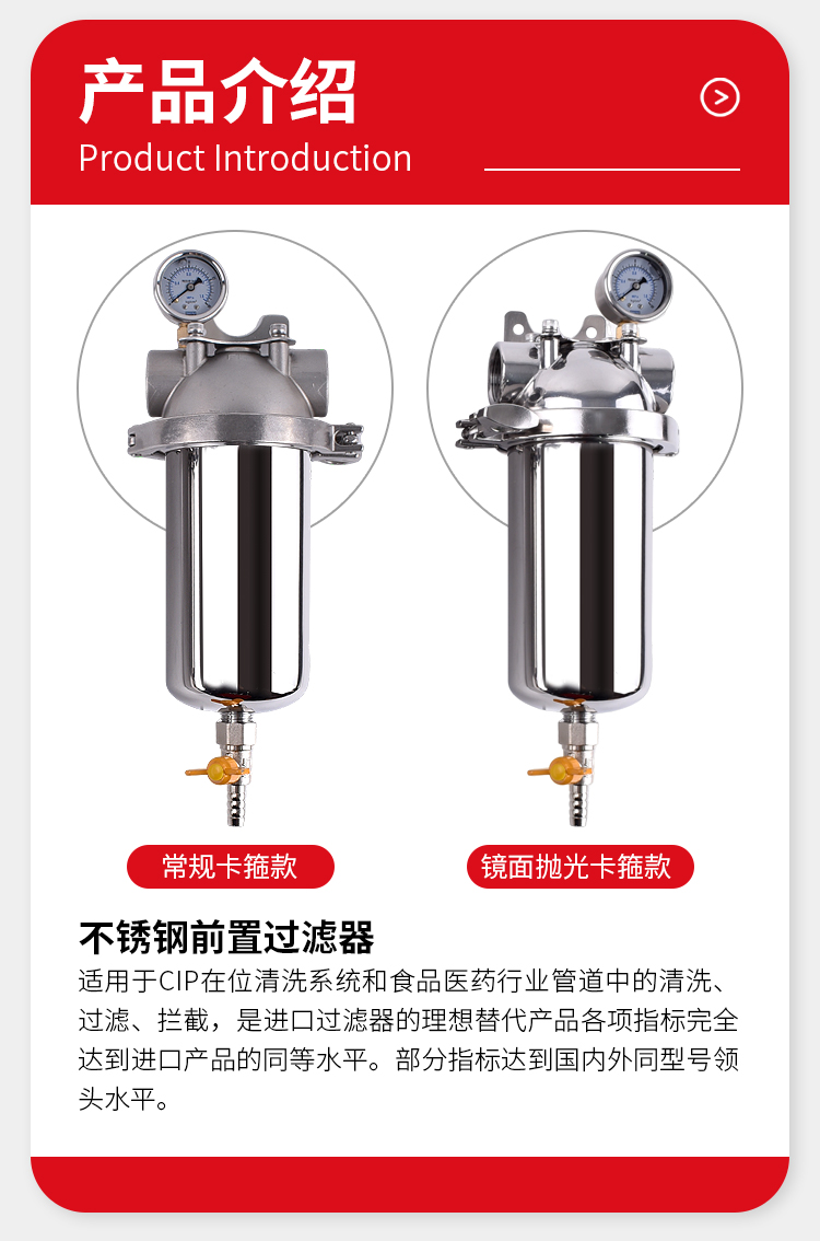 不锈钢工业前置过滤器是安装在工业管道前端,对流体进行初步过滤的设备,能有效去除流体中的悬浮微粒、杂质等,保护下游设备正常运行。