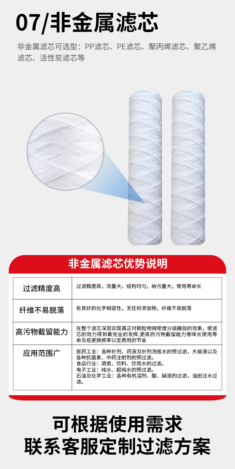 • 制药行业:在原料药生产、药液配制和灌装等环节,拦截原料和药液中的颗粒杂质、微生物,确保药品无菌、无异物,符合药品生产规范。