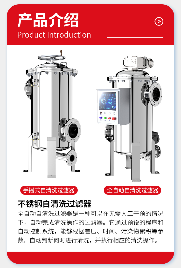 自清洗过滤器是用于过滤水中杂质、净化水质的精密设备。水从进水口进入,经滤网拦截杂质,净化后的水从出水口流出。当滤网杂质堆积到一定程度,系统会自动识别并启动清洗程序,排出污物,且清洗时系统不间断供水。