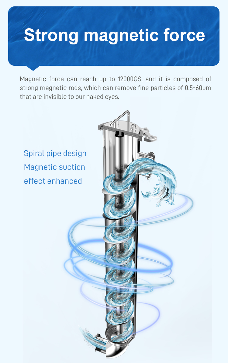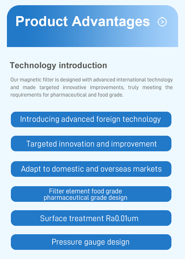 It is widely applied in industries such as chemical engineering, pharmaceuticals, pigments, dyes, food, metallurgy, ceramics, petrochemicals, refrigeration, and plastics. It is used to separate the fine iron filings contained in liquid media, reduce the iron ion content in products, improve product quality, protect the accessories on equipment pipelines from wear and blockage, and ensure the normal operation of equipment.