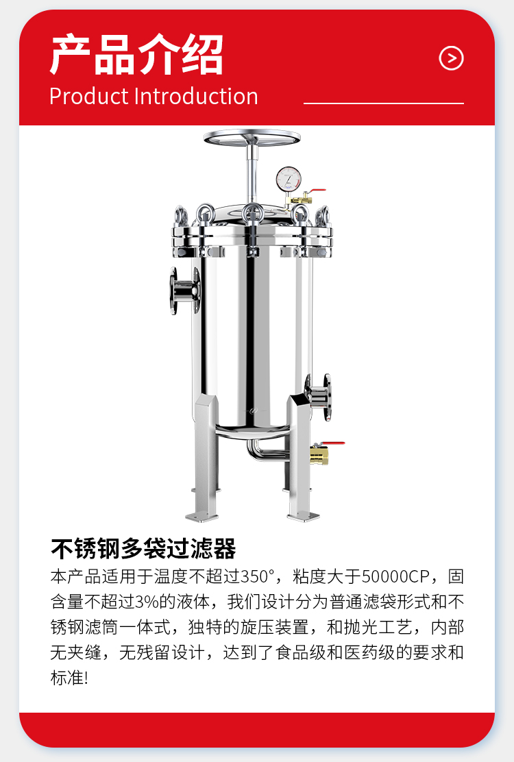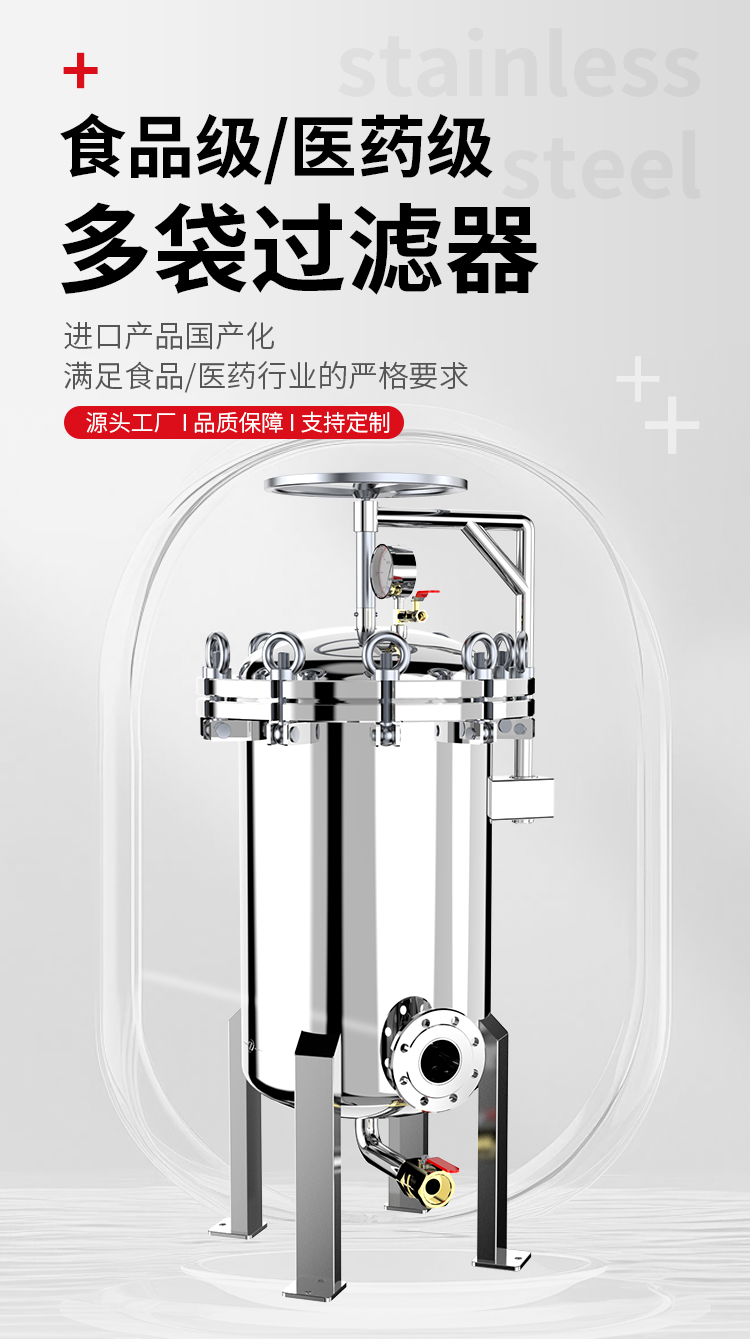 不锈钢多袋过滤器是一种精密过滤设备,采用优质不锈钢材质,由壳体、滤袋、密封系统等组成。通过泵将待过滤液体输入,液体经滤袋截留杂质后,清洁液体排出,杂质积累到设定压差时需更换滤袋。