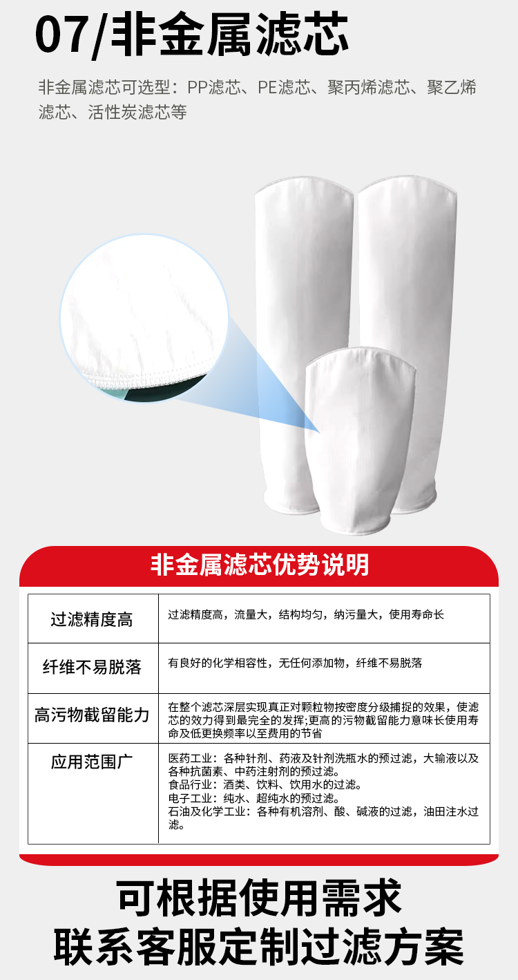 • 广泛应用于多个行业,包括食品饮料(如果汁、啤酒、食用油等澄清过滤)、化工制药(酸碱溶液提纯、催化剂回收、药液澄清过滤)、环保水处理(工业废水预处理、海水淡化)、电子电镀(超纯水制备、镀液净化)、机械加工、造纸、印染等,也适用于处理酸碱溶剂、油品、高黏度液体等,适用pH范围0 - 14。