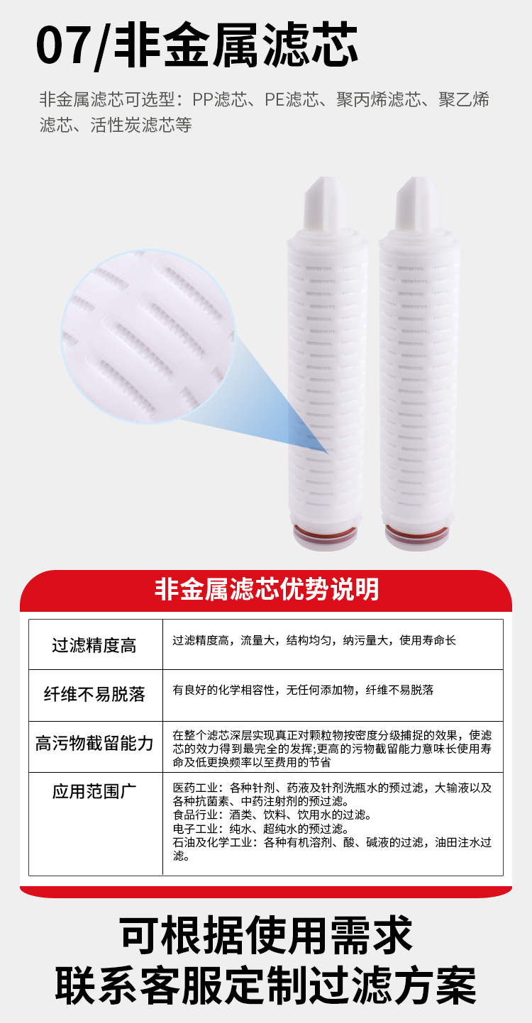 • 制药行业:在原料药生产、药液配制和灌装等环节,拦截原料和药液中的颗粒杂质、微生物,确保药品无菌、无异物,符合药品生产规范。